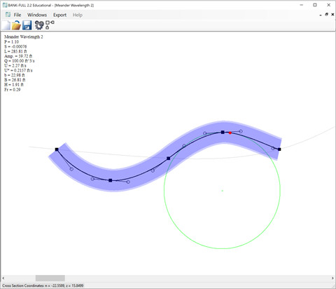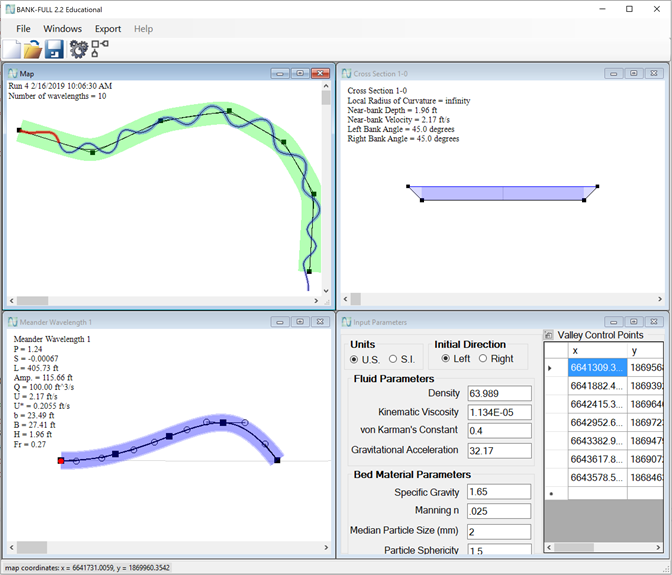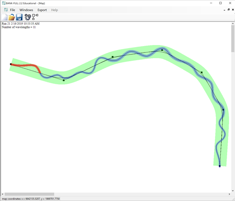 Instantaneously computes and displays (1) the smooth valley space-curve, (2) the kernel, (3) a random collection of meander wavelentghs having the kernel as the mean value, (4) projection of the meanders along the curved valley, (5) bed topography and (6) 2D depths-averaged velocity perturbations.